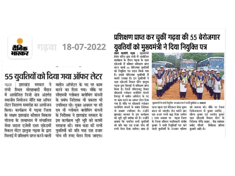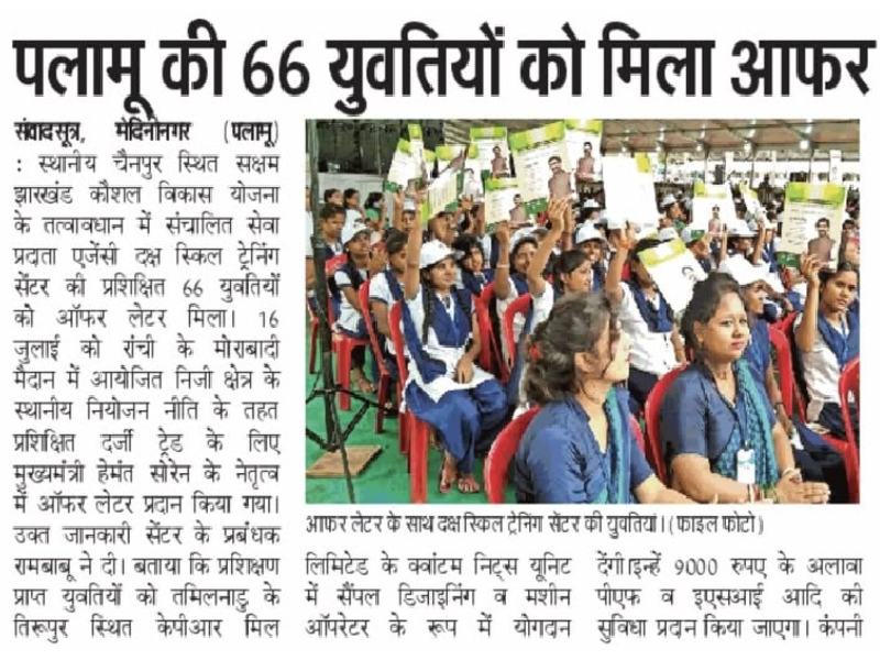 Daksya Academy, Garwah Students attended the Certification and Offer Letter Distribution event in Morabadi Grounds, Ranchi. 55 students from the center were offered jobs at CMV Mills Coimbatore. Chief...